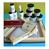 Speedball Ultimate Screen Printing KitThis really IS the ultimate screen printing kit. It has everything that you need to print on fabric paper cardboard wood- just about any ink receptive substrate. The kit includes one 8x10 inch screen frame one 10x14 inch screen frame one base with hinges one 9 inch squeegee one 4oz Process Cyan Acrylic Ink one 4oz Process Magenta Acrylic Ink one 4oz Process Yellow Acrylic Ink one 4oz Black Acrylic Ink one 4oz Red Acrylic Ink one 4oz Screen Filler one 4oz bottle of Drawing Fluid one 4oz Diazo Photo Emulsion one 4oz Diazo Photo Emulsion Remover one 1/2 gram of Diazo sensitizer one Paint Brush Mixing Sticks Tracing Paper an Instruction Booklet and a 55 minute instructional DVD. This kit is ideal for getting started as a gift or for someone who already knows how to screen print- but wants to get away from using toxic solvent based inks and materials. Read more